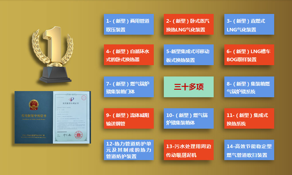 公司技術(shù)骨干編寫(xiě)的專(zhuān)利,已申請(qǐng)并獲批了“兩用管道取壓裝置”(專(zhuān)利號(hào)ZL 2018 2 0240323.1)、“臥式蒸汽換熱LNG氣化裝置”(專(zhuān)利號(hào)ZL 2018 2 0226469.0),“直燃式LNG氣化裝置”等三十多項(xiàng)發(fā)明型和實(shí)用型專(zhuān)利。